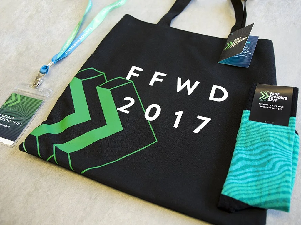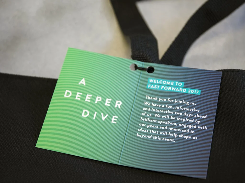 Fast Forward is an exclusive hospitality industry event hosted by Global Allies & The Gettys Group. I had the opportunity to work with The Gettys Group to brand the 2017 edition of this event, creating the look and feel inspired by the theme “A Deeper Dive”. I created abstract wave patterns that evolved into a graphic lens for branded name tags, notebooks, socks, bags and other various materials including the inspiration for the event set design.