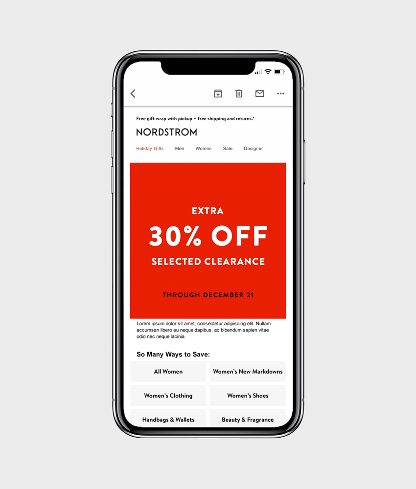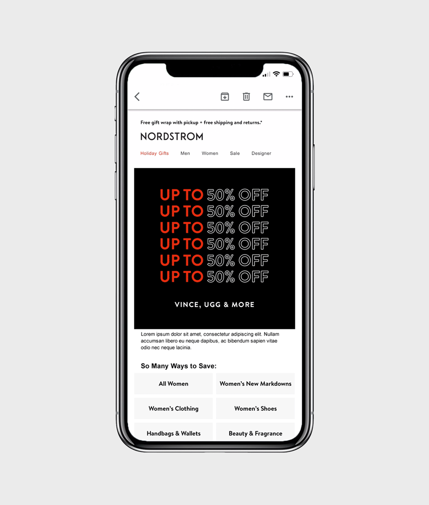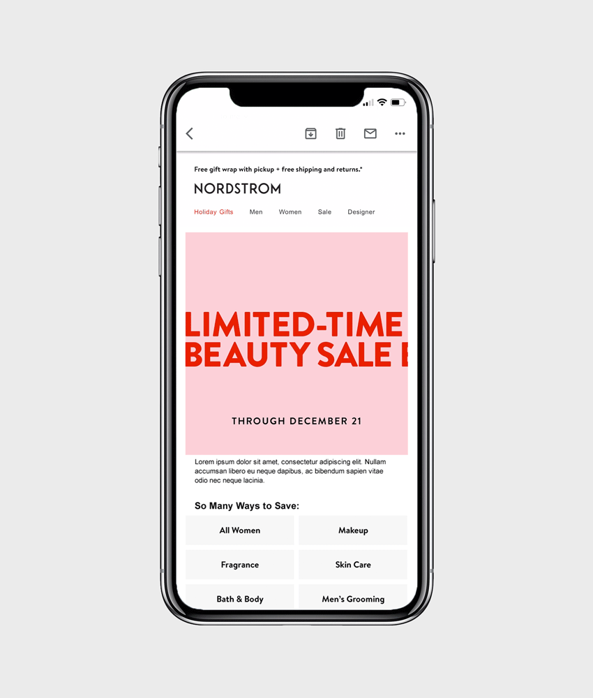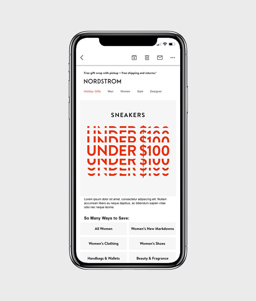 When developing a sale system for Nordstrom, I created a standardized template system of eye-catching graphic animations that could be easily updated by designers without motion graphic experience. Given the fast-paced nature of these sales initiatives, product imagery could not be featured, so the percent off and limited time messaging were our primary focus.